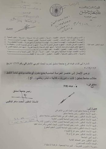 ووفقاً للتعميم الذي نشره “تلفزيون الخبر” الموالي فإنه صدر بناءً على “تعليمات” رئيس الجامعة “محمد ماهر قباقيبي” وكتاب فرع جامعة دمشق لـ “حزب البعث” رقم 1/679 تاريخ 2019/12/2.
