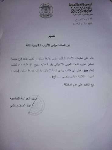ونص التعميم على “منع دخول أي طالب يرتدي لباساً لا يليق بطلاب جامعة دمشق (نقاب، شورت، كلابية، لباس رياضي..) مع التأكيد على عدم المخالفة”.