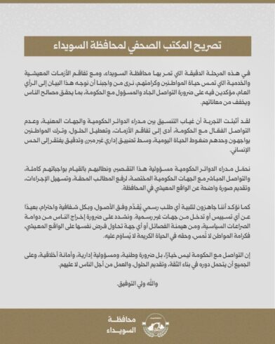وحمّل البيان مدراء الدوائر الحكومية في المحافظة مسؤولية هذا التقصير وطالبهم بالقيام بواجباتهم كاملة والتواصل المباشر مع الجهات الحكومية المختصة، لرفع المطالب المحقّة وتسهيل الإجراءات، وتقديم صورة واضحة عن الواقع المعيشي في المحافظة.