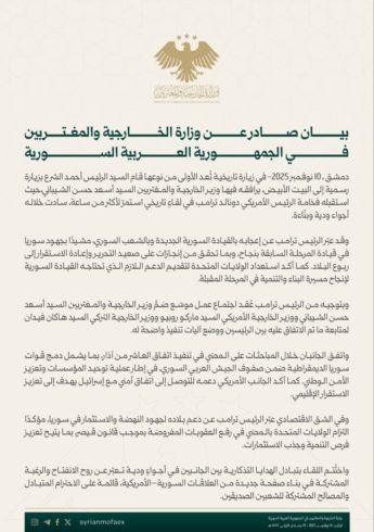 قالت وزارة الخارجية في بيان رسمي إنه خلال زيارة تاريخية تُعد الأولى من نوعها قام السيد الرئيس أحمد الشرع بزيارة رسمية إلى البيت الأبيض، برفقة وزير الخارجية والمغتربين السيد أسعد حسن الشيباني، حيث استقبله الرئيس الأمريكي دونالد ترامب في لقاء تاريخي استمر لأكثر من ساعة، سادت خلاله أجواء ودية وبناءة.