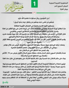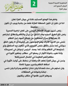 وأكد جيش العزة أنه لن يقبل بأن تكون المنطقة العازلة من الجانب المحرر فقط وطالب بأن تكون مناصفة بين مناطق الثوار ومناطق النظام.