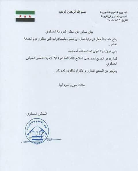 ودعا البيان جميع المتظاهرين إلى عدم حمل السلاح أثناء تواجدهم في ساحات التظاهر، مستثنياً عناصر المجلس العسكري لكفرومة فقط.