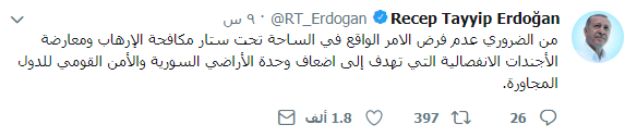 وأكد أردوغان في تغريدة أخرى على ضرورة عدم “فرض الأمر الواقع في الساحة تحت ستار مكافحة الإرهاب”، مشيراً إلى مخاوف الحكومة التركية تجاه أمنها الأقليمي من الميليشيات الكردية المدعومة أمريكياً في شمال سوريا.