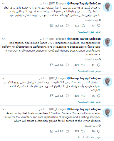 ونشر “أردوغان” تغريداته بأربع لغات “التركية والعربية والروسية والإيرانية “، في إطار إظهار رسالة موحّدة للداخل التركي والخارج العربي والروسي والإيراني، بحسب ناشطين.