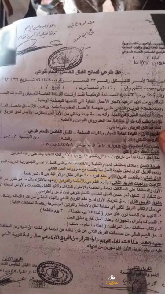 وجاء في صورة العقد المسربة المنسوب للفيلق الخامس: إن “القيادة العامة للجيش والقوات المسلحة التابعة للنظام، ارتأت التعاقد مع من لديهم الرغبة لإنجاز الأعمال القتالية التي تقتضيها المصلحة العامة”.