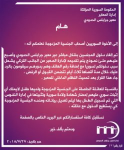 وأوضحت إدارة المعبر أنه على السوريين الحاصلين على الجنسية التركية والراغبين بالدخول إلى سوريا عبر معبر جرابلس تقديم طلب لإدارة المعبر من الجانب التركي يشمل سبب الدخول ورقم الهاتف.