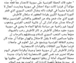وأشار مراسل “حلب اليوم” إلى أن صفحة “محافظة السويداء” الموالية للنظام قالت في 15 نيسان الجاري، إن “جان غورو حفيد قائد الحملة الفرنسية على سوريا جاء إلى صرح القائد العام للثورة السورية الكبرى سلطان باشا الأطرش في بلدة القريا بريف السويداء الجنوبي، وذلك لتقديم الاعتذار عما فعله جده”، مضيفاً أن “غورو الحفيد” أكد أن فرنسا كانت دولة احتلال في سوريا.