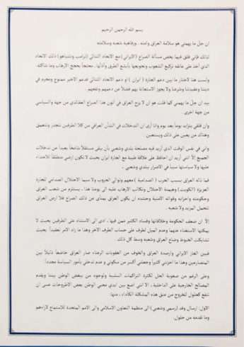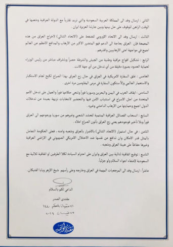 كما أبدى الصدر قلقه من “تزايد التدخلات بالعراق”، مشيراً إلى “ضرورة إرسال وفد إلى السعودية التي تشهد علاقاتها مع العراق، تقارباً”.