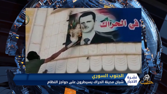احتجاجات وإضراب وحرق حواجز النظام وصور بشار الأسد في مدينة الحراك بدرعا